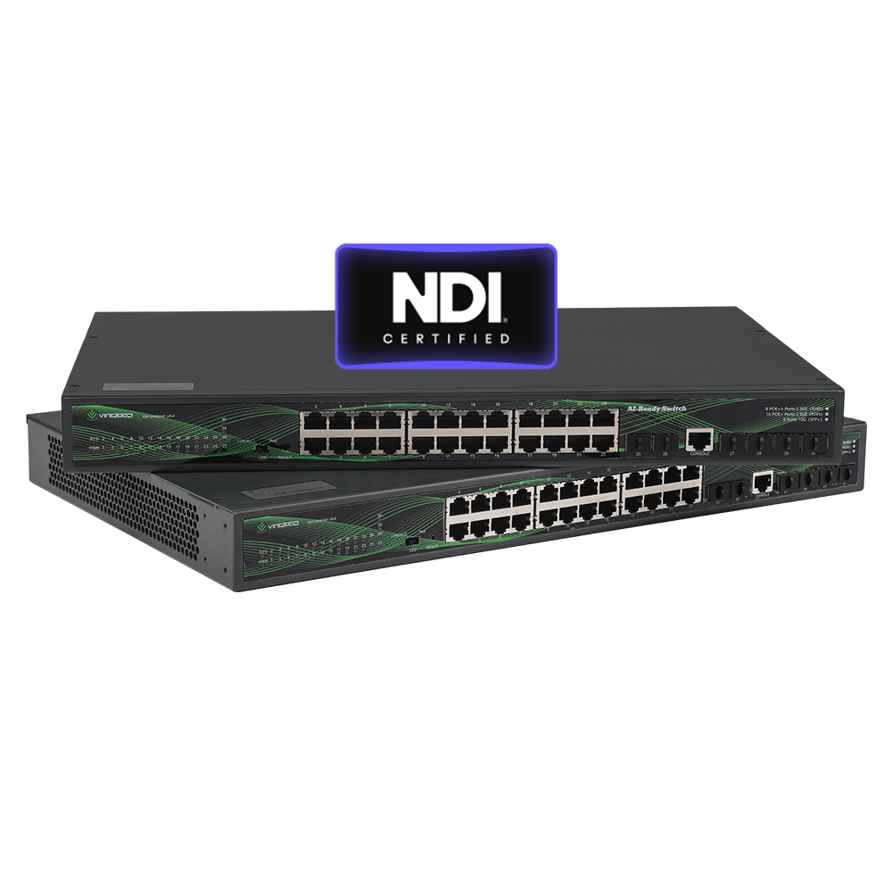 This is an NDI plug-and-play switch featuring 24×2.5Gbps PoE ports (8x90W and 16x30W) and 6x10Gbps uplink ports. The AIM-24MG6XF-UPoE comes with built-in AV-OS, enabling NDI to work seamlessly with multiple AV-over-IP technologies within a single network. As an AI-ready switch, it supports VINGLOOP network management system AINM-8500 for comprehensive control of the entire AV-over-IP network.